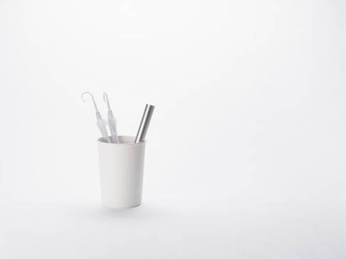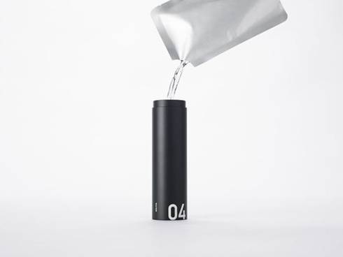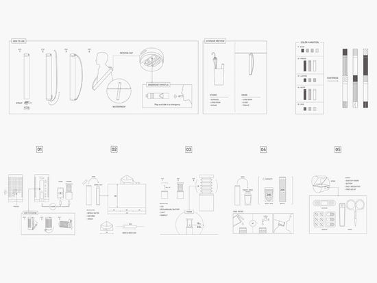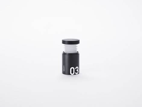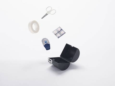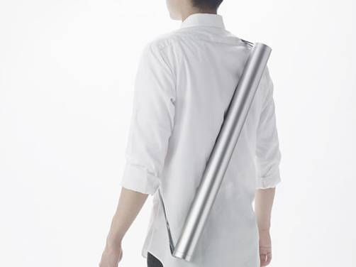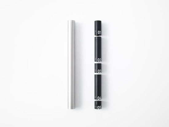 nendo挑选最需要的物品,有的可以装进圆筒里,有的直接设计成圆筒的形状,然后叠放进一个直径5厘米的长条圆筒中。急救包外另配有一根单肩背带,可以斜跨在后背上或提在手里,有黑、白、银三种颜色选择。