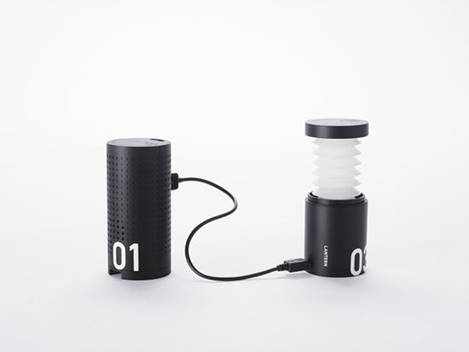 1 号是一个收音机,它的一端配有一个手摇式的充电装置,侧面有连接手机的 USB 插口,既可以收听外界讯息,也可以为手机持续供电。拉开手摇杆立在桌面上,也是一个手机的支撑。